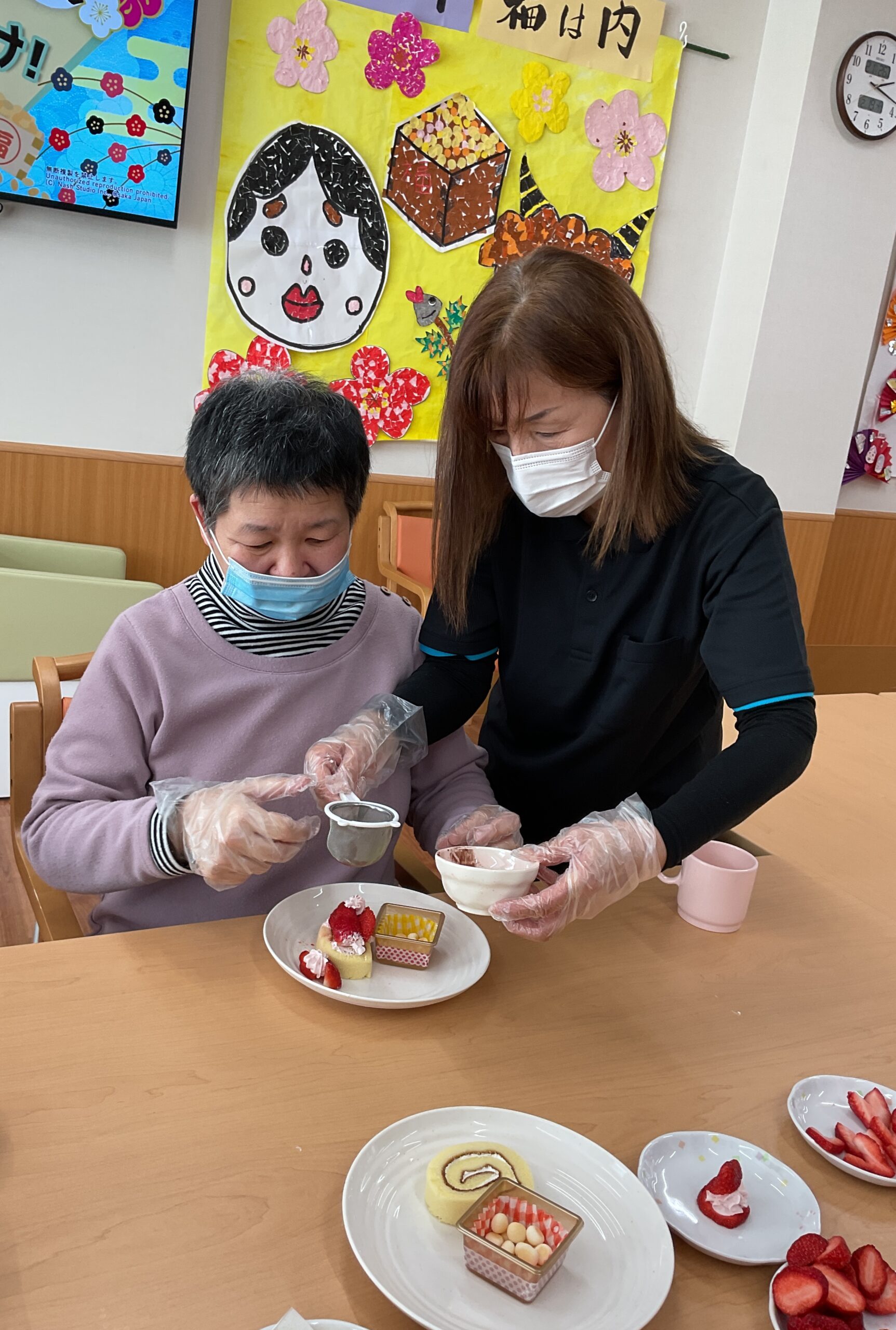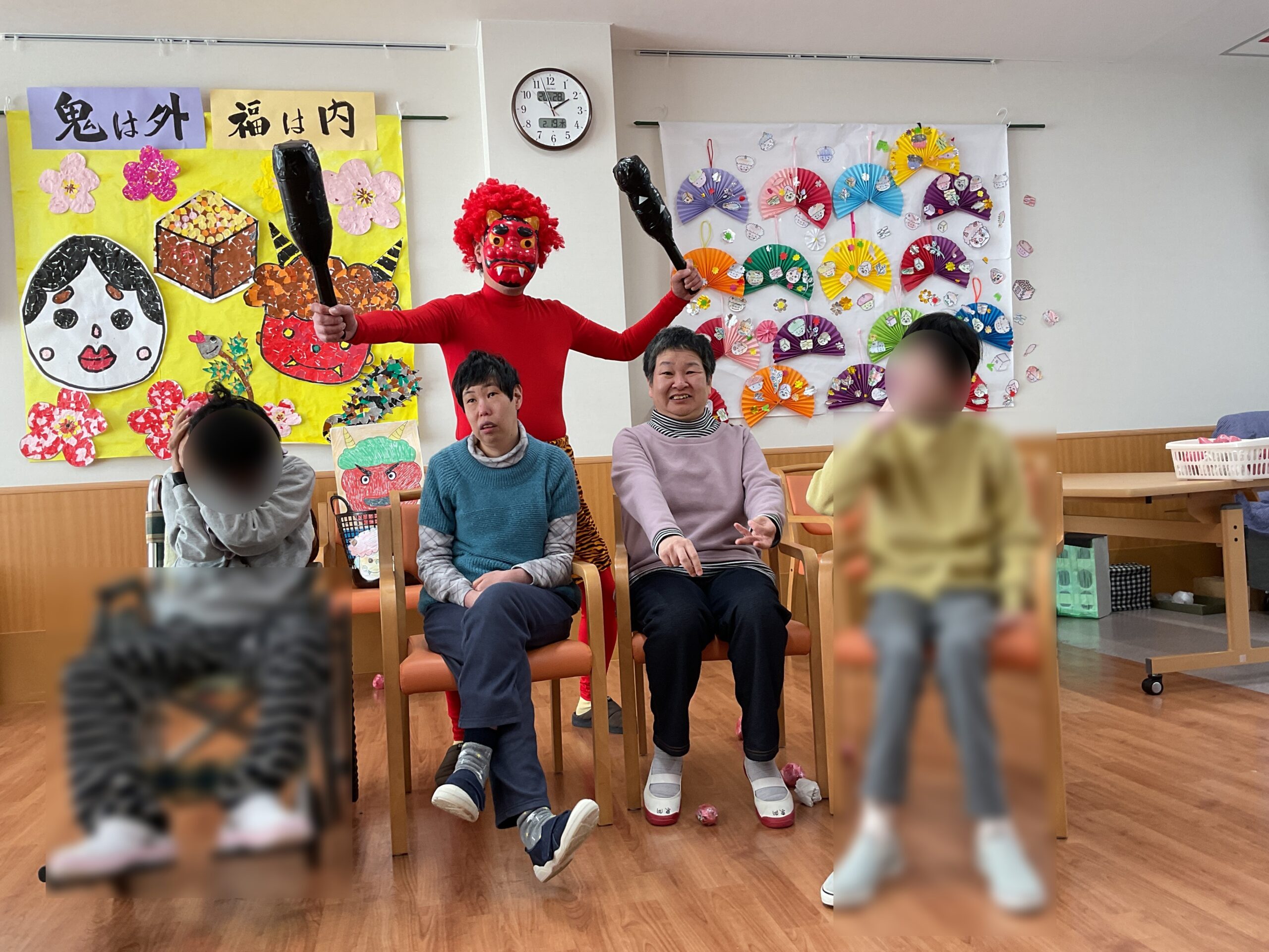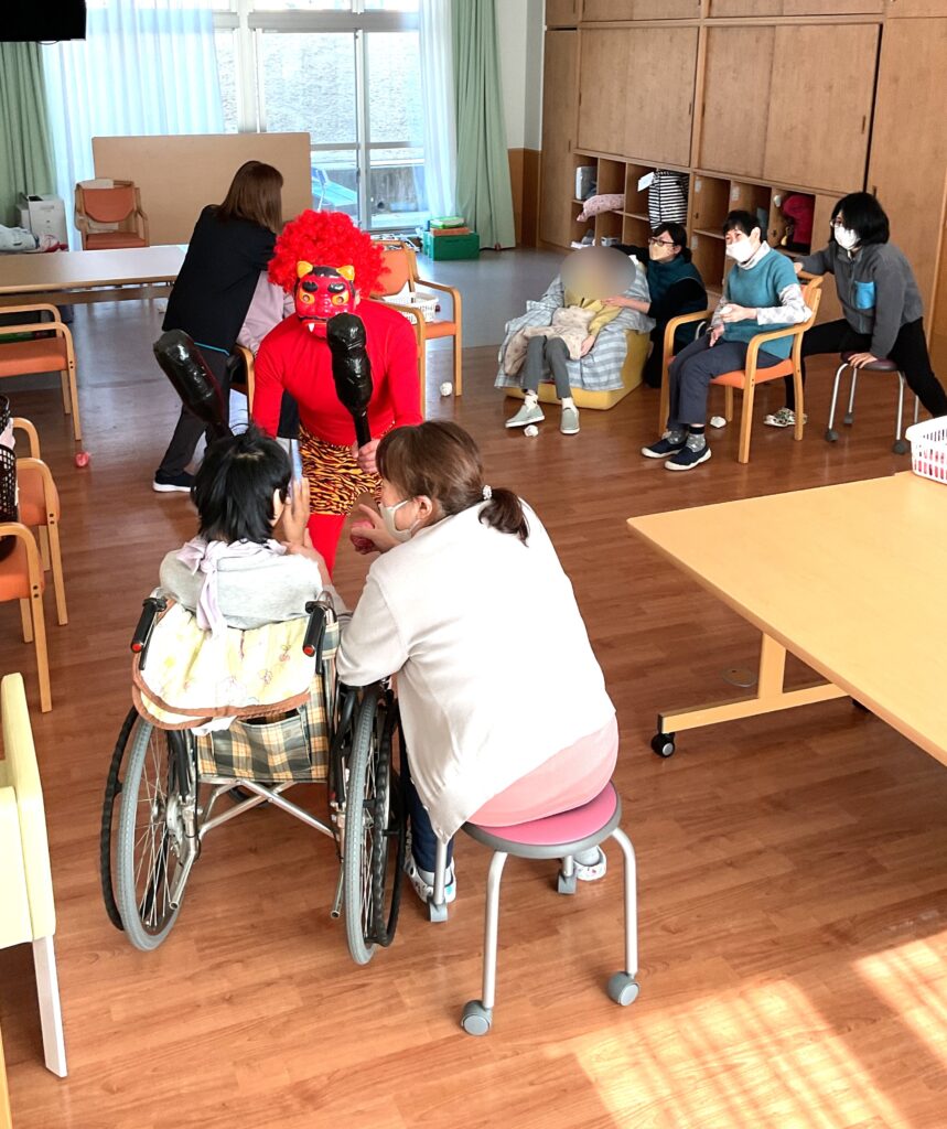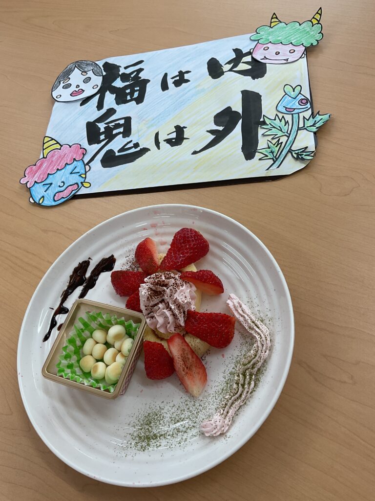 藤 節分会 2026年2月25日 最終更新日時 : 2026年2月25日 たかしま会デイサービスセンター藤で節分会を開催しました。鬼退治の練習に玉入れをした後、鬼が登場し『鬼は外、福は内』の掛け声と共に鬼目がけて玉を投げました。みなさん一生懸命投げてくれたおかげで無事鬼退治をすることができました。その後、季節のデザートをいただきました。